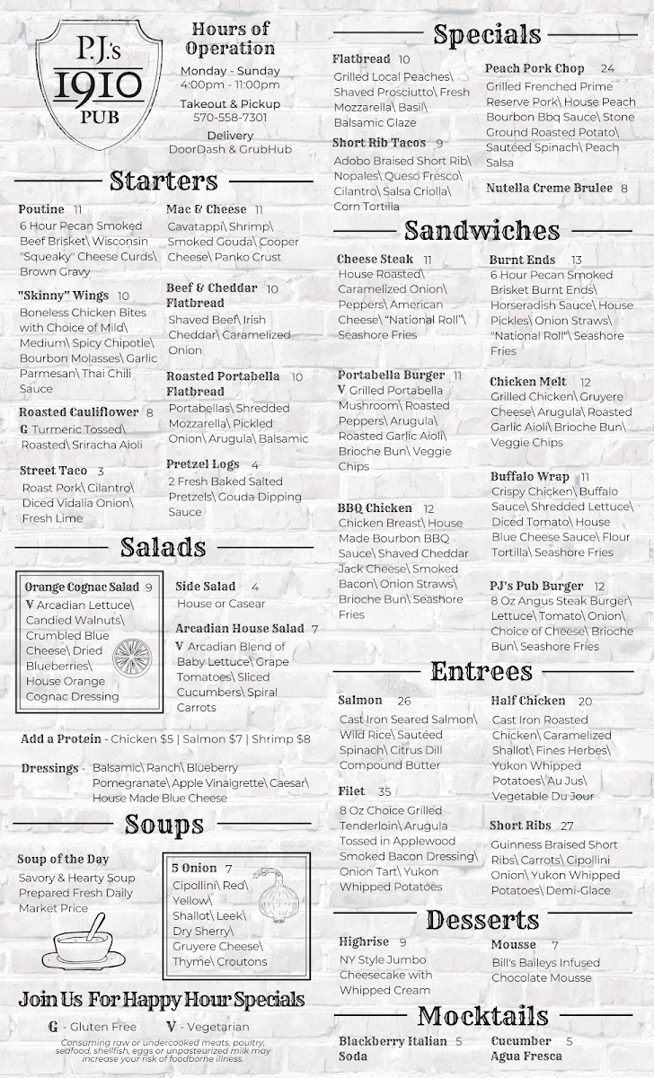 Welcome to PJ’s 1910 Pub, a hidden gem located at 100 Adams Ave in Scranton, PA. This charming establishment offers a menu that beautifully balances comfort and sophistication, making it a must-visit for local and visiting food lovers alike.